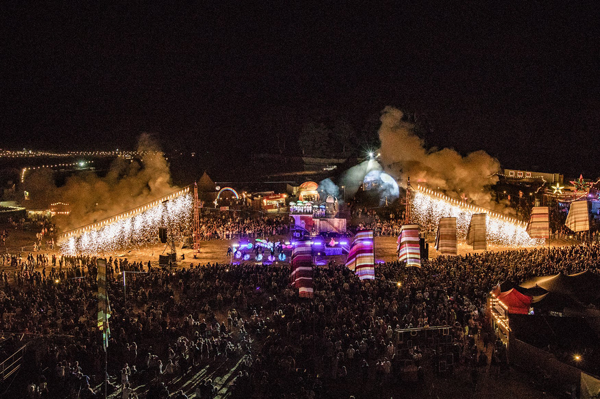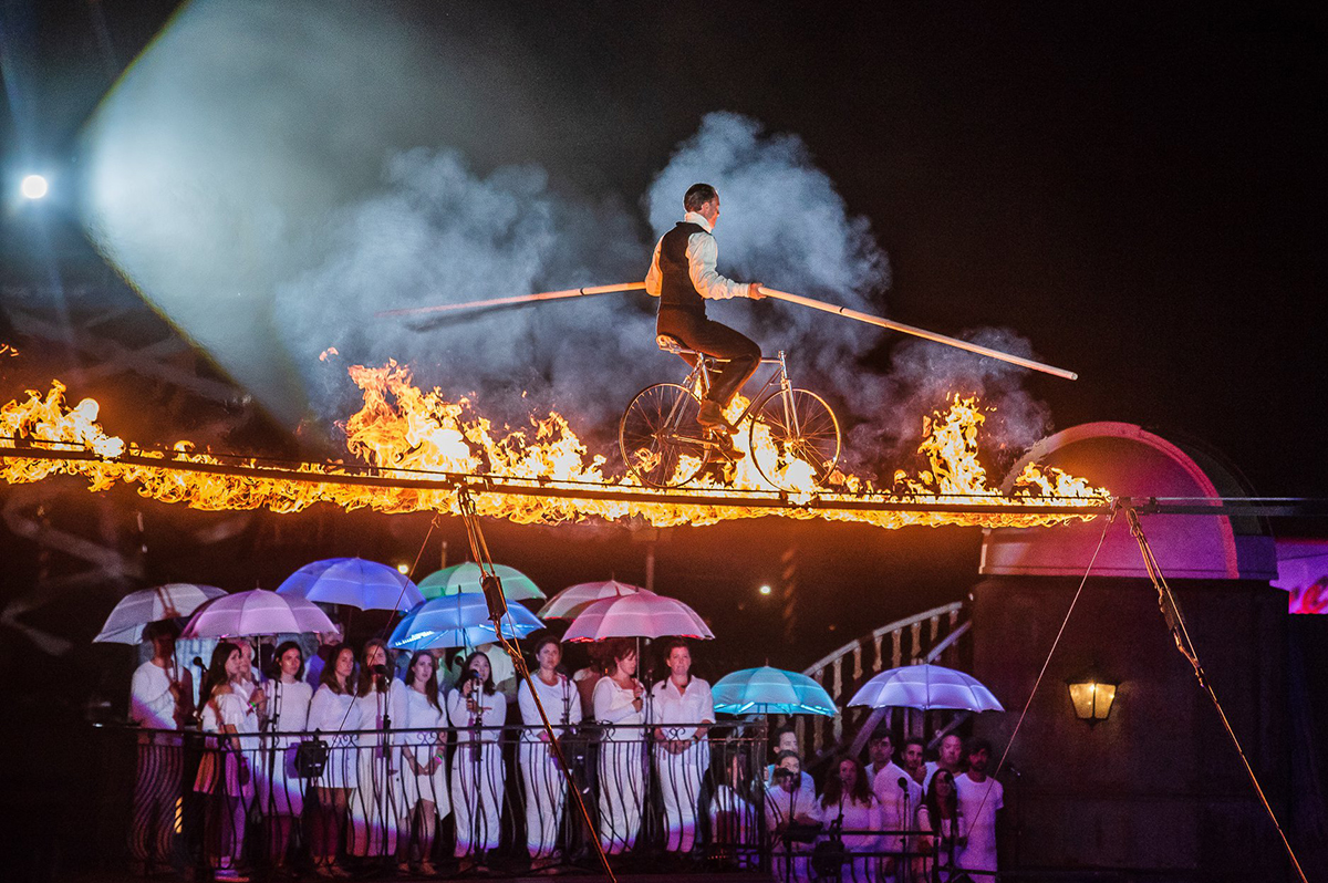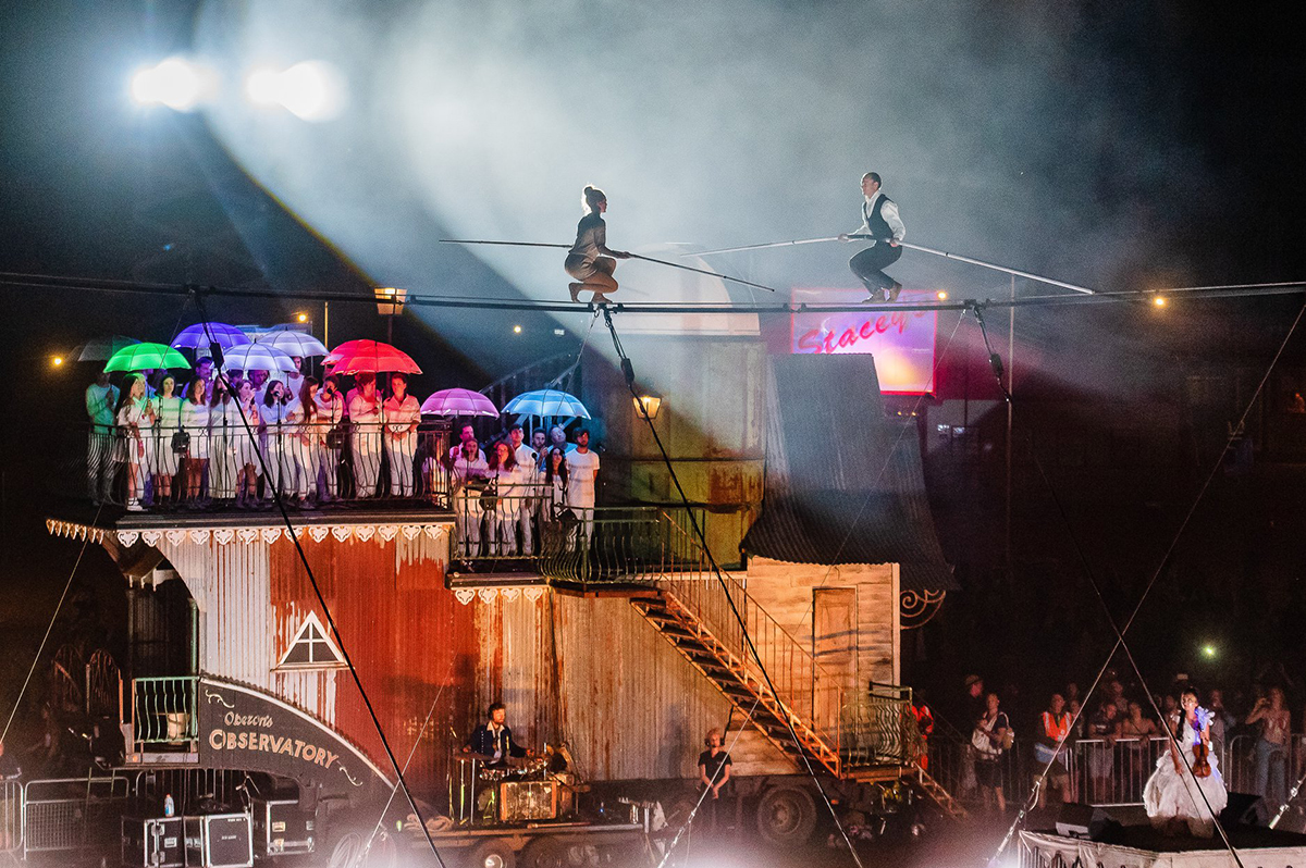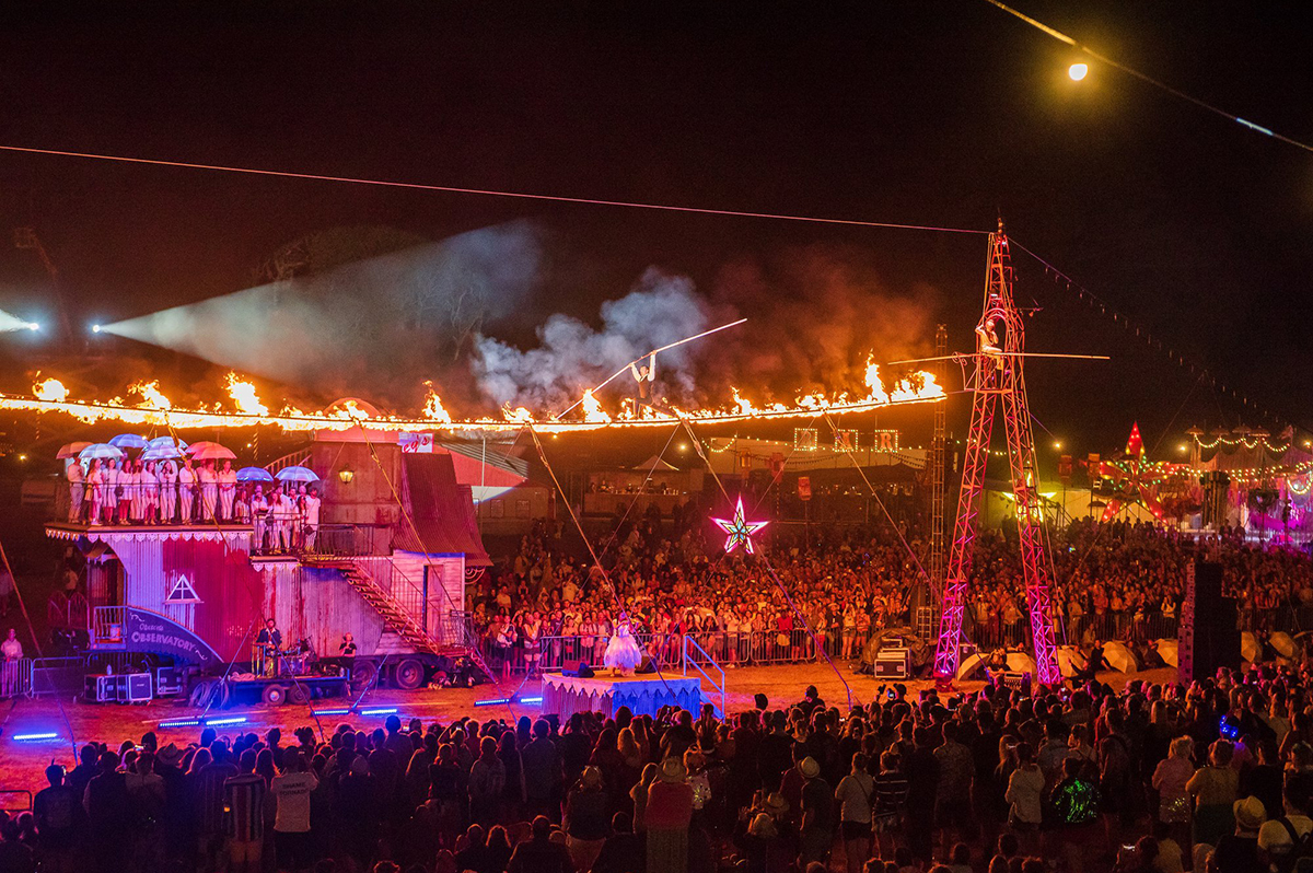 Upon Oberon’s Observatory the London Contemporary Voices Choir filled the sky with song as dust danced in the flood light, and Michael Fergie conducted the rhythm on his drum kit. For the pièce de résistance the lower wire ignited with flame and Jade Kindar Martin performed his unique and astounding Fire Wire act, walking and cycling a bike across the burning wire.