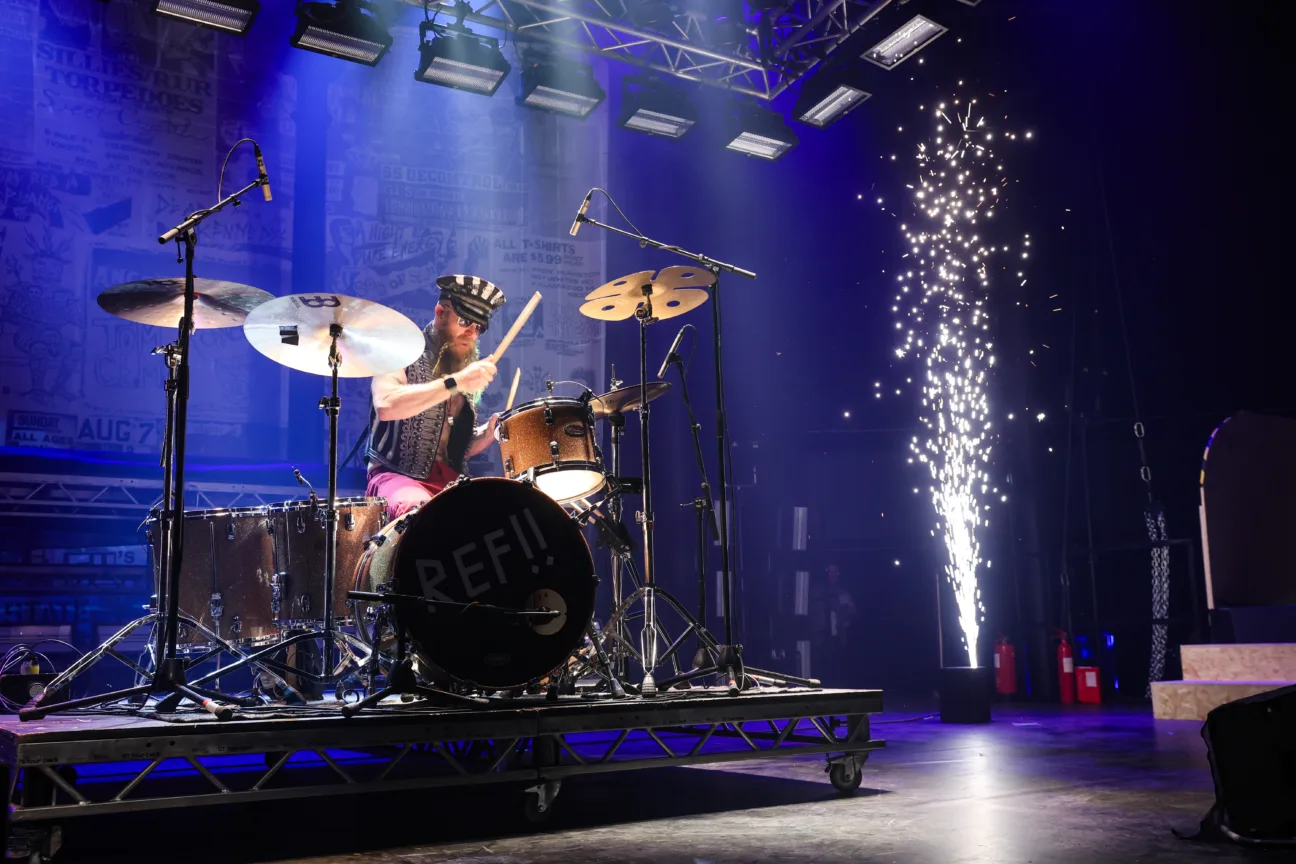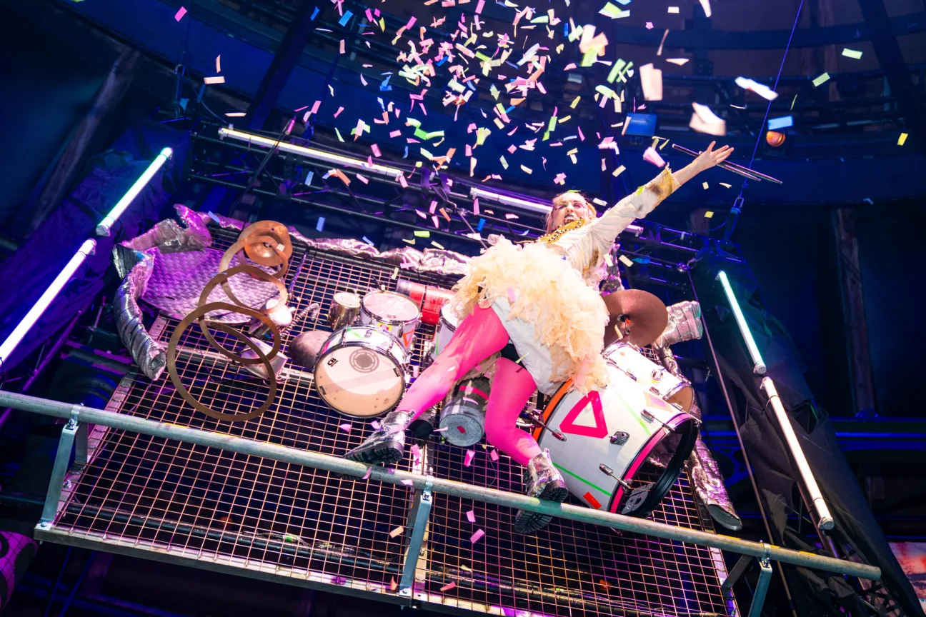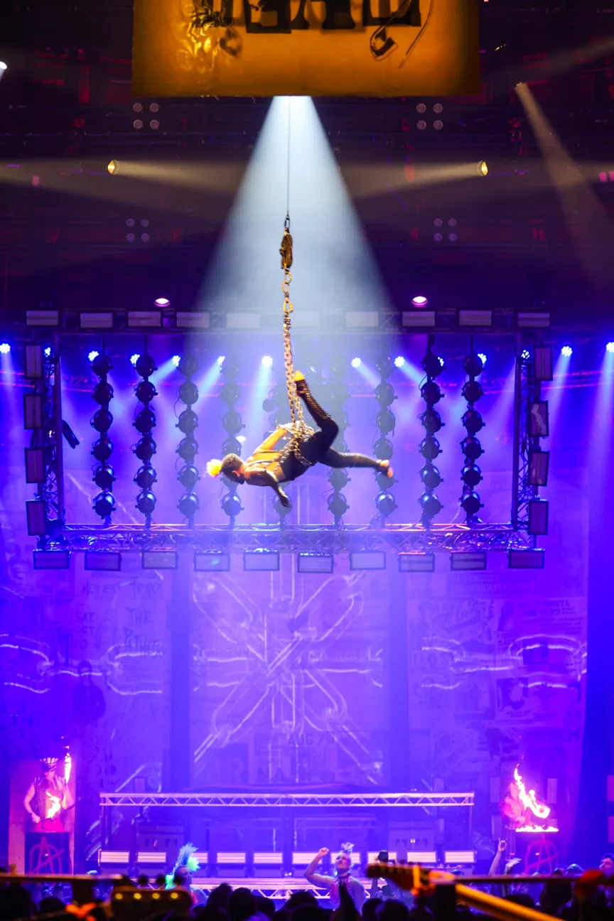 The second part of the show was the premiere of our Aerial Drum Battle. This pitted two very different drumming characters – a Dark Goth Rebel and a Neon Sparkly Crowd pleaser – against each other high up on an aerial rig. We had a Referee Drummer on stage and a Dodgy Dealer Compere who together kept the battle in disorder. This act was a bespoke creation for this show, however It can be modified for future bookings. Do you want a high flying drum battle at your event?