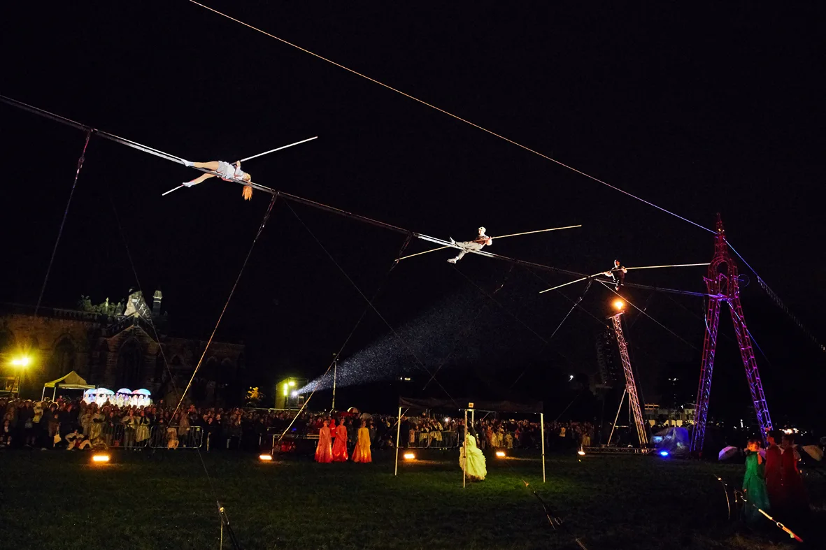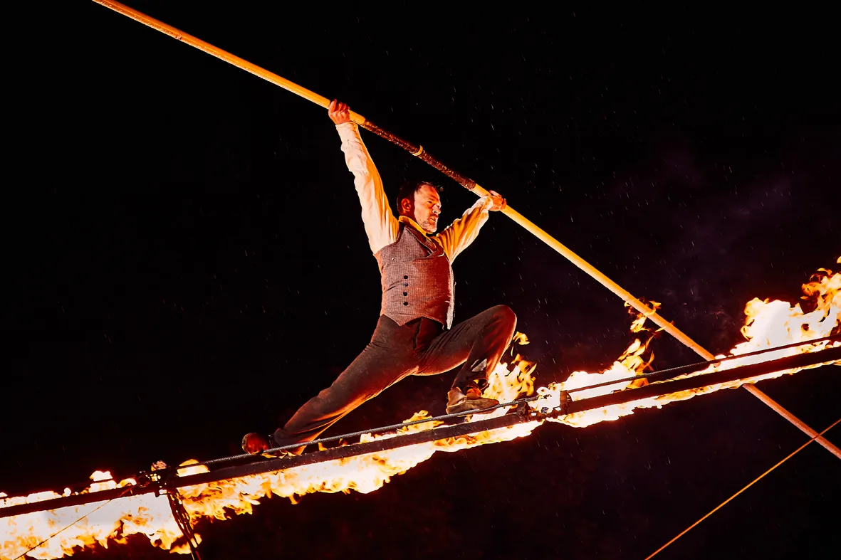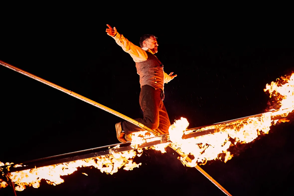 The show, alive with colour, flame and song, featured world renowned high wire artists Jade Kindar Martin, Johanne Humblet, and the incredible Bullzini family. To top off the show Jade performed his incredible and daring Fire Wire act which involved him walked and riding a bike over a flaming high wire, a one of a kind dramatic crescendo not seen anywhere else in this world.