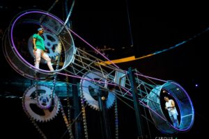 In 2022 we created an immersive circus show for a private client’s Christmas party. We told the story of an evil old ringmistress called Magpie, who kept a troupe of circus performers trapped within her monochrome world. When she was finally defeated, technicolor was restored! Shooting Flowers made the brilliant costumes for this event – a full monochrome set, and then a complete technicolor makeover.