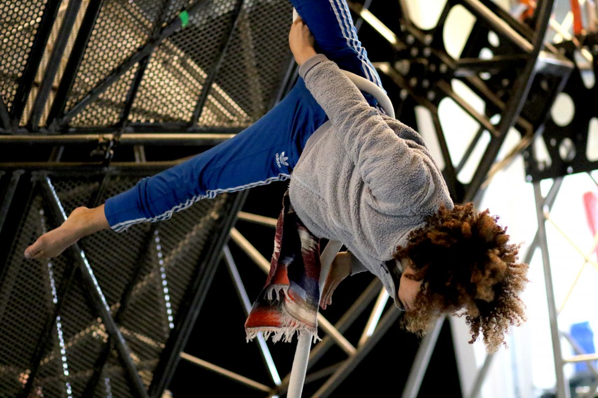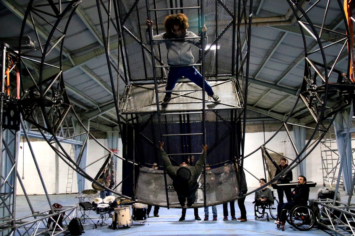 After a tech week in Bristol last week, the structure is now in the 101 Outdoor Arts Creation Space in Newbury where the whole company are devising and rehearsing the show. The tipping and spinning circular structure, built by Will Datson who also built ‘The Bridge’ for Extraordinary Bodies’ last show Weighting, will sit at the heart of the show, and the artists will dance, fly, flip, catch and sing upon the transformative stage.