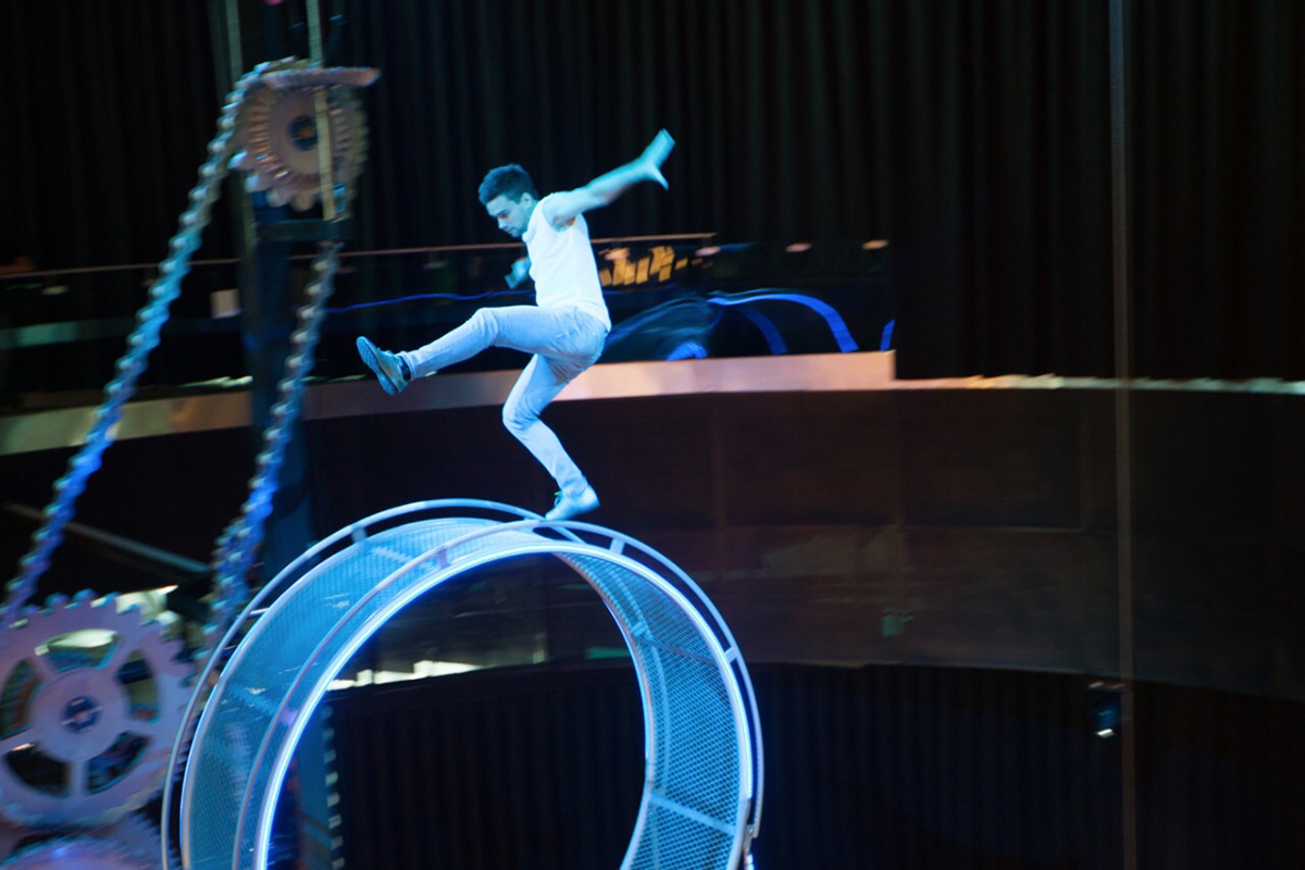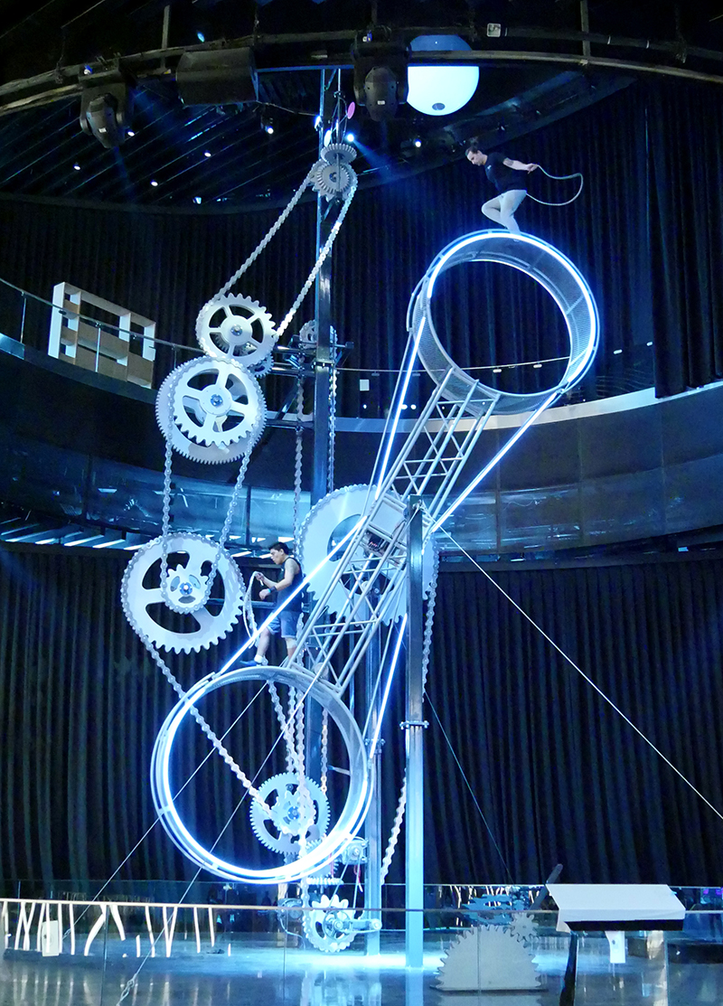 In a spectacularly daring show that runs throughout the day, world-class circus artists use their own energy to set the sculpture in motion, performing unbelievable stunts in a display of absolute fearlessness. The circus troupe includes performers from Ecuador, Argentina, Colombia and Australia